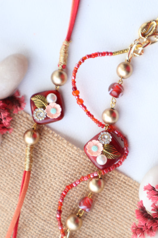 Kamule Beads Embellished Bracelet Bhaiya Bhabhi Rakhi Set of 2 - Red