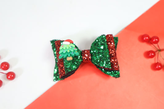 Kamule Christmas Theme Detailed Glittery Christmas tree Charm Detailed Bow with Designer pins Pack of 3-Green and Red
