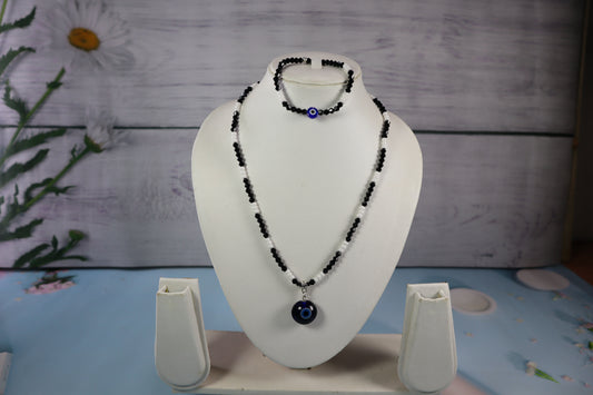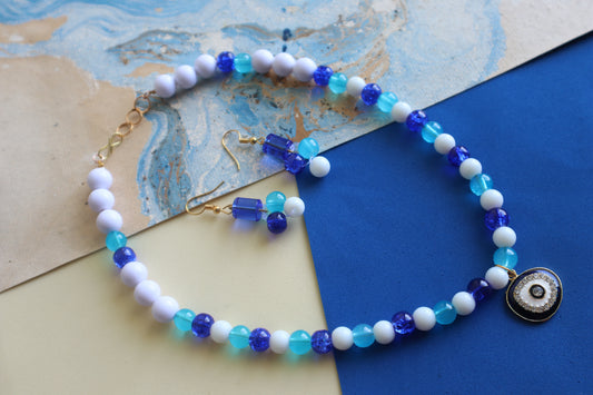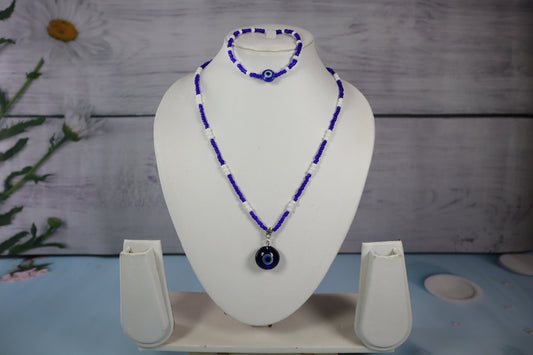 Kamule Beads Embedded Evil Eye Hair Clip and Glass beads Necklace Pack of 5 - Blue, White
