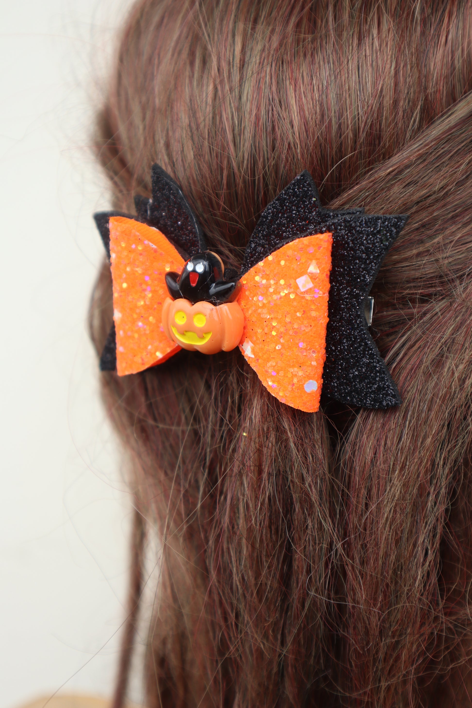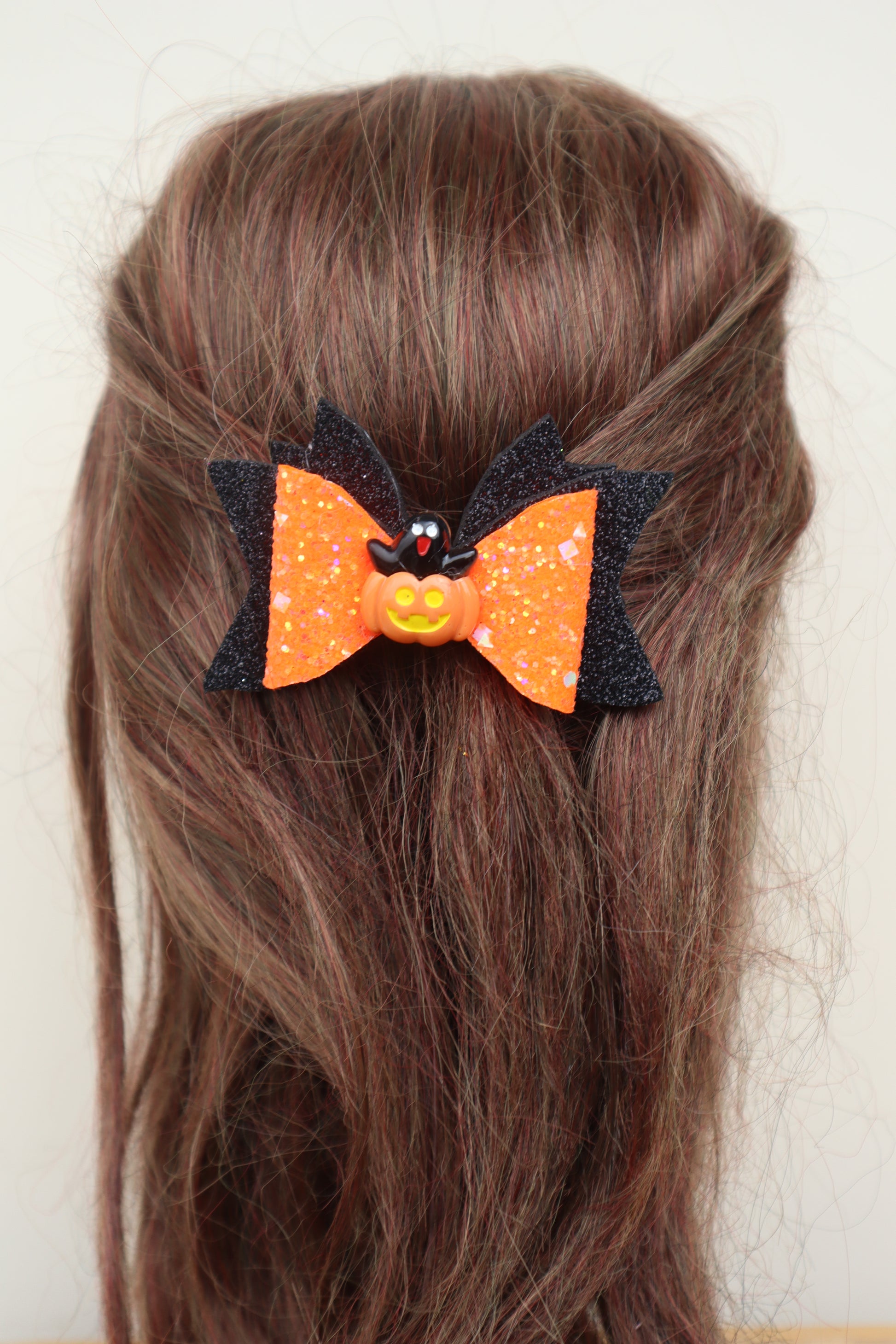Celebrate Halloween in style with this charming hair clip adorned with a pumpkin detail and a bow. The vibrant orange and purple colours add a festive touch, making it a perfect accessory for kids to complete their Halloween look.